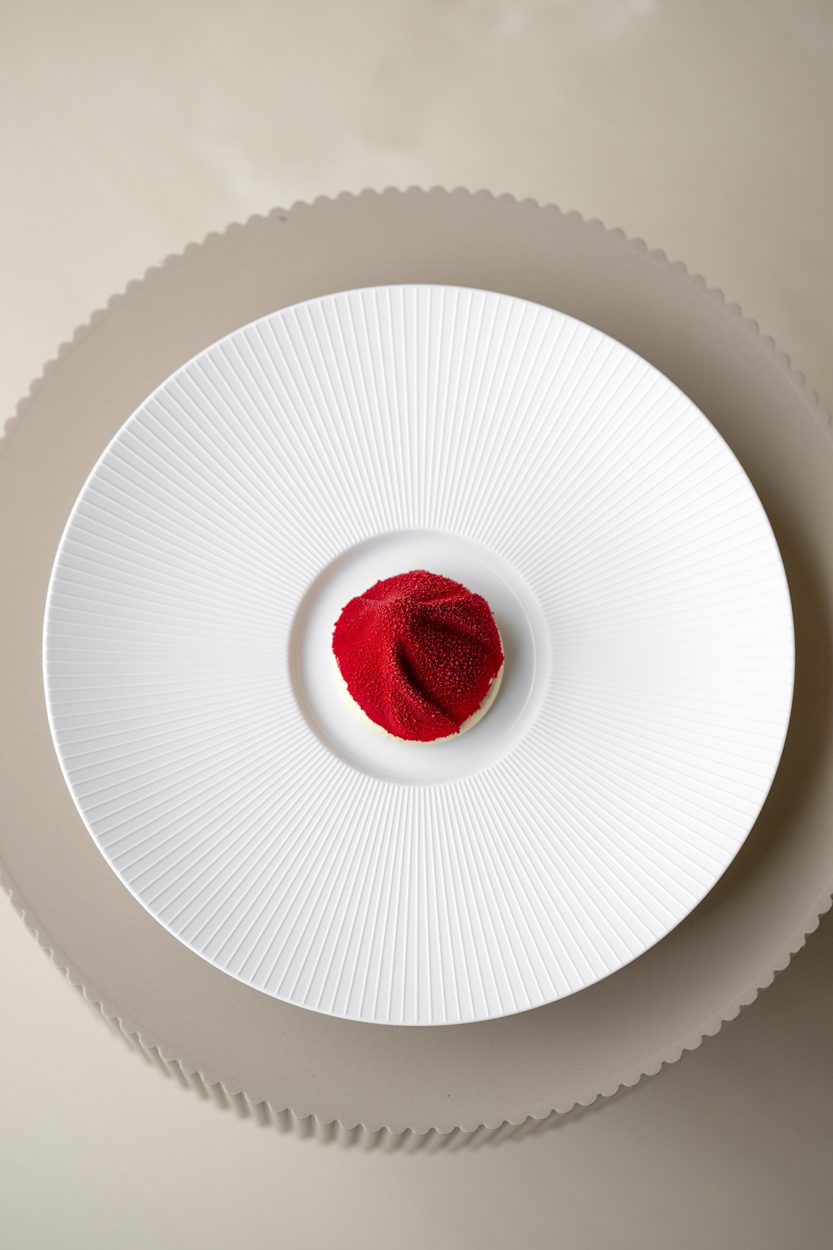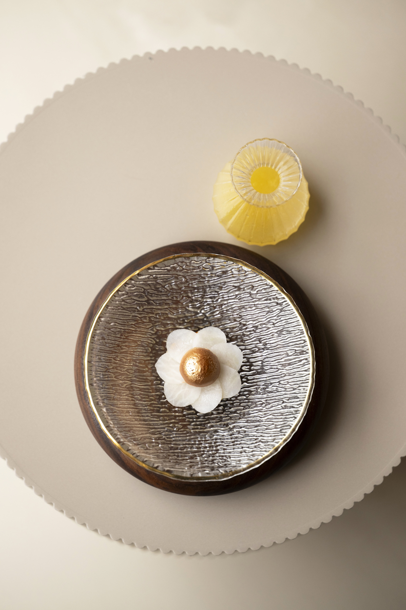 Tartaar van Coquille, hazelnoot, crème cru, vinaigrette van yuzu en gember, zoet-zure rettich.