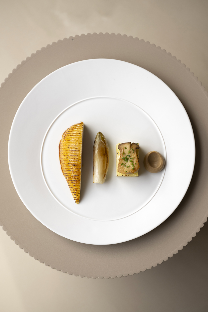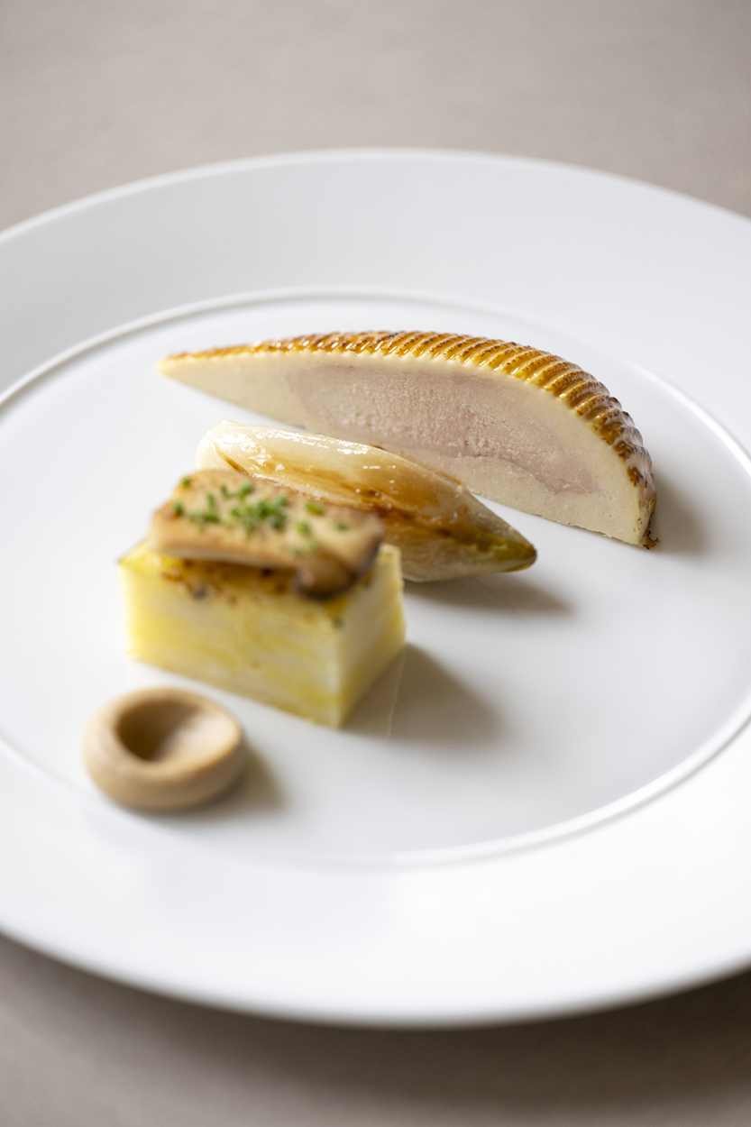 Parelhoen, Brussels lof, gepofte knolselderij, romige aardappel, king oyster.