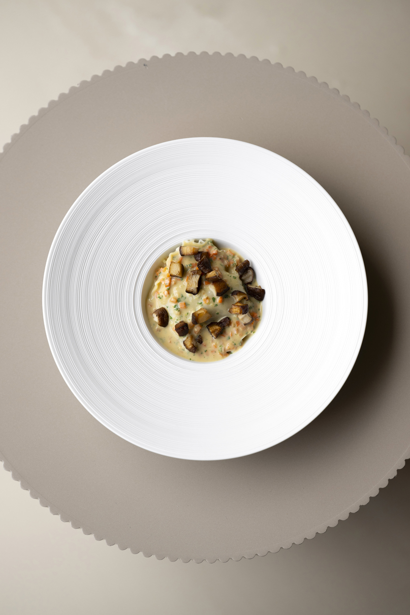 Ravioli van ossenstaart, velouté van prei en wortel, shii-take, peterselie.
